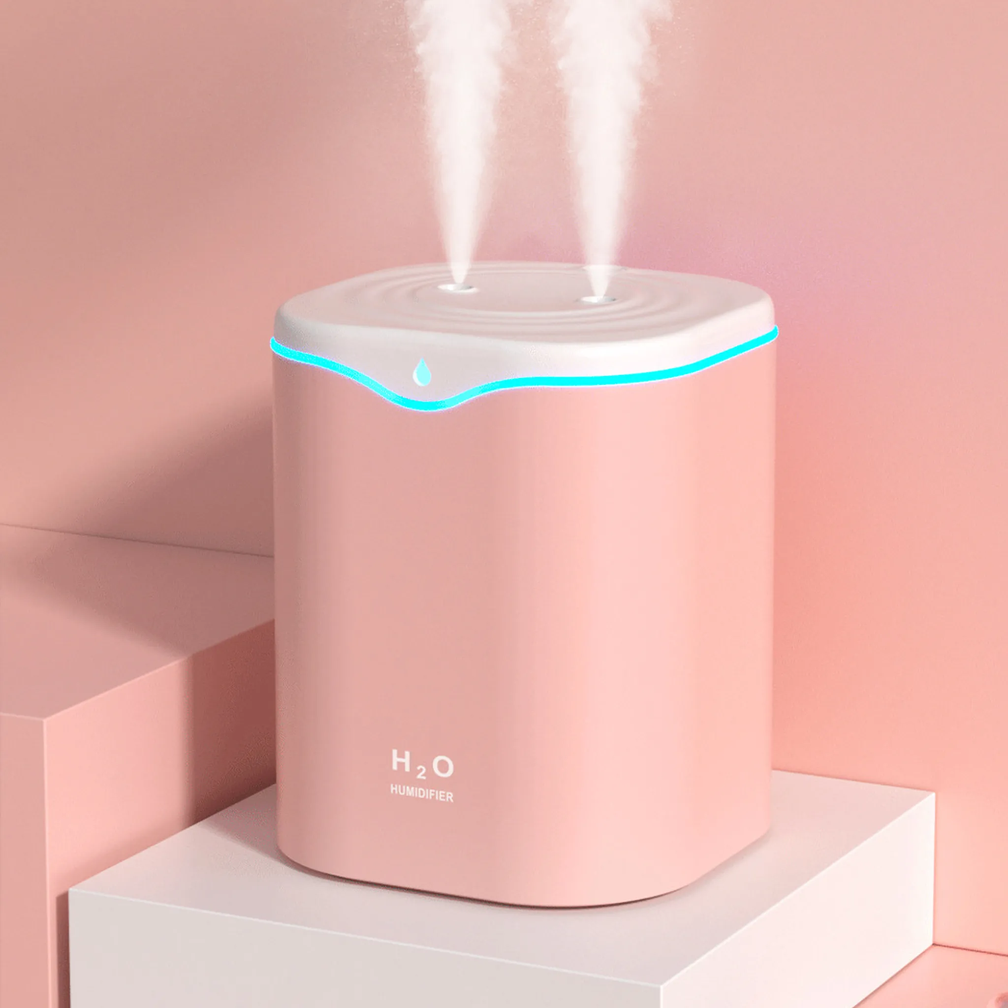 Highlights: Doppeldüse für intensive Befeuchtung, 12-Stunden-Laufzeit, automatische Abschaltung, LED-Nachtlicht, leiser Betrieb, 2L-Wassertank – ideal für Schlafzimmer, Babyzimmer oder Büro.