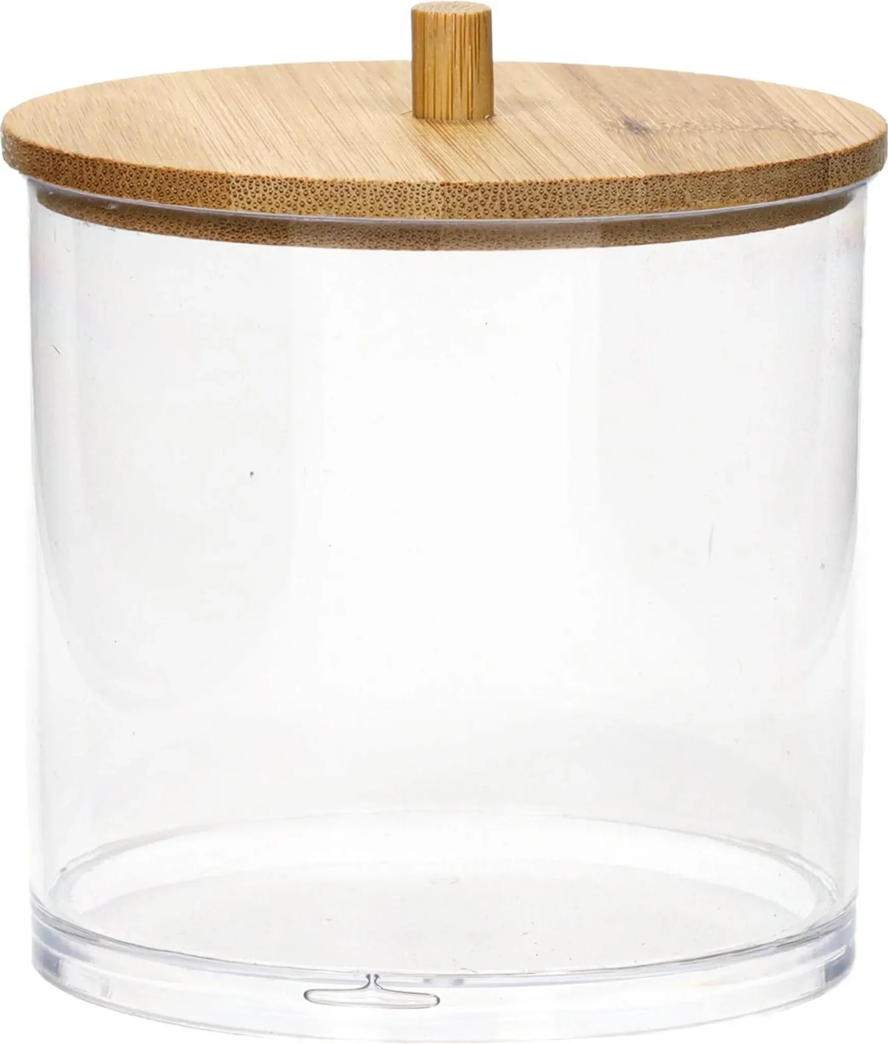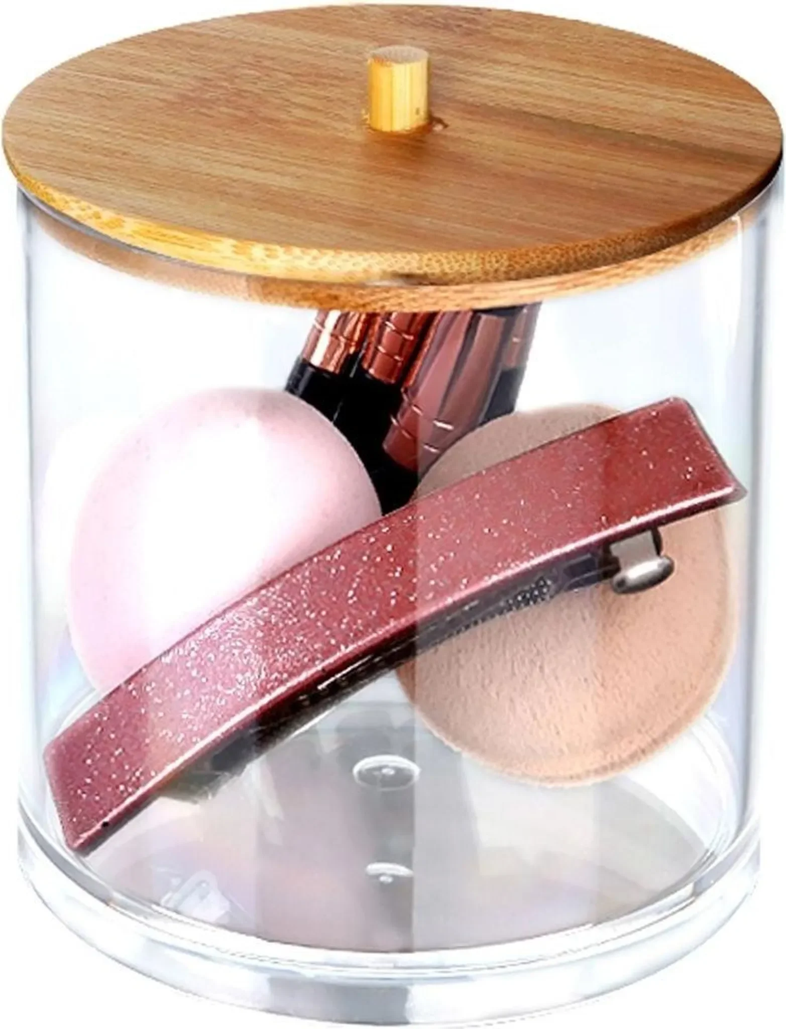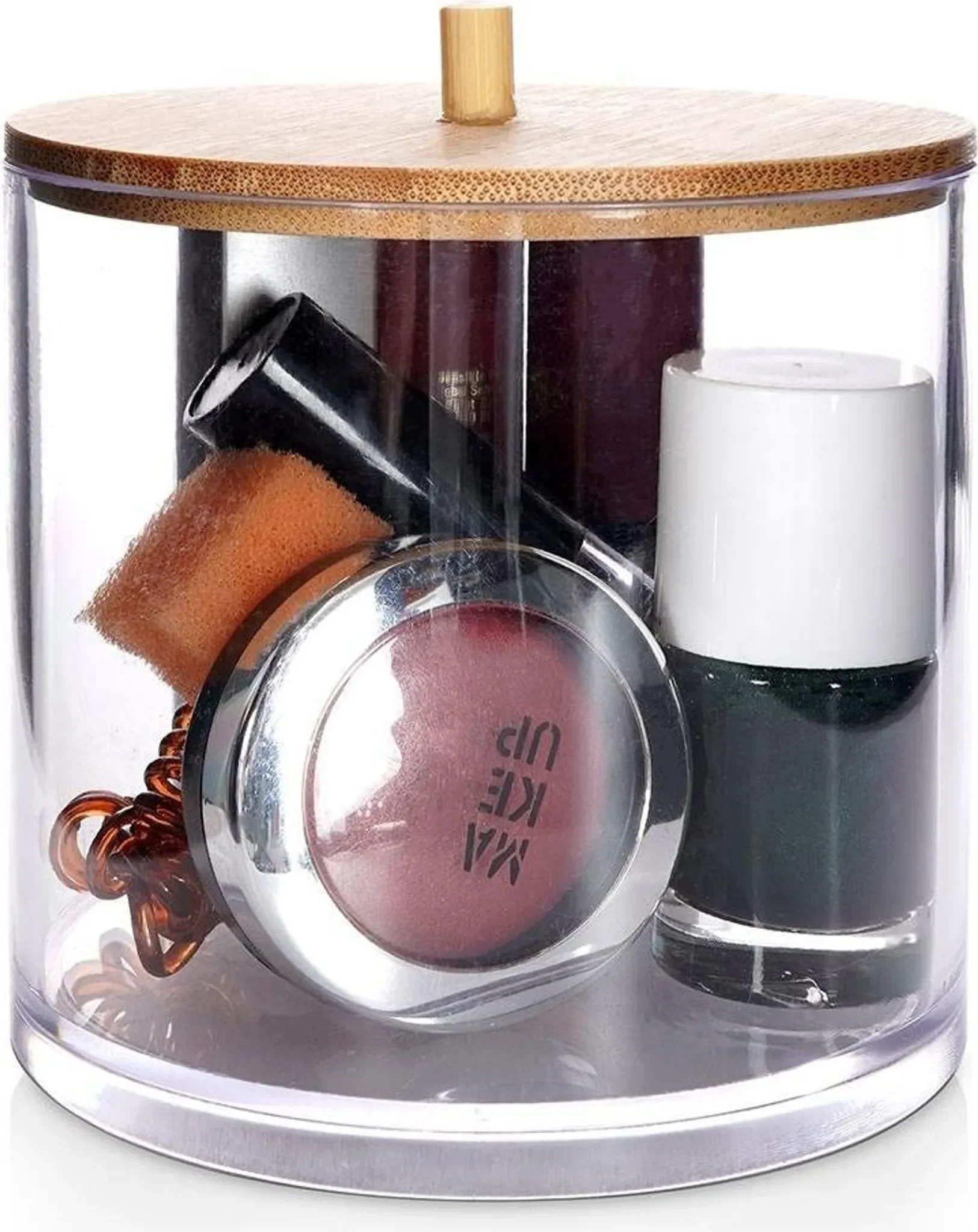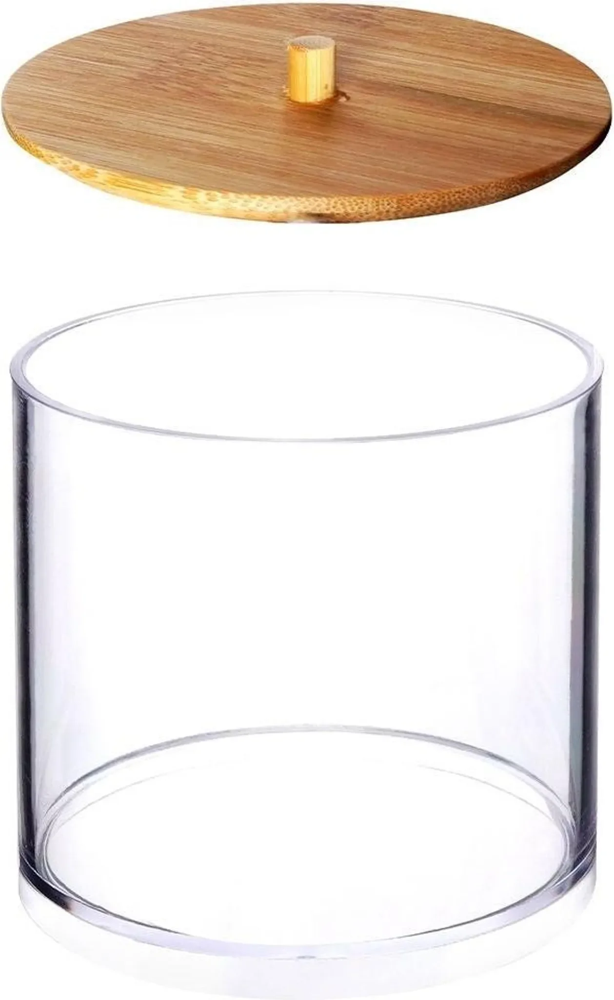 Highlights: Transparente Aufbewahrung für Make-up & Wattepads, natürlicher Bambusdeckel als Staubschutz, platzsparendes Format, pflegeleicht & langlebig – stilvoller Ordnungshelfer für jedes Bad.