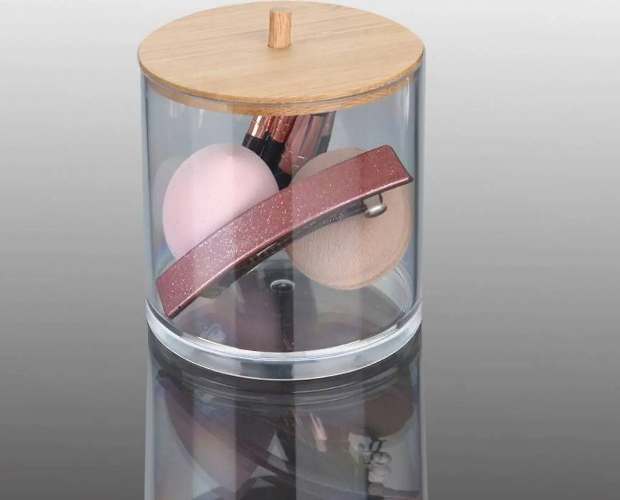 Hergestellt aus langlebigem Kunststoff, ist der Organizer widerstandsfähig, leicht zu reinigen und kompakt genug, um auch auf kleinen Ablagen Platz zu finden. Der Bambusdeckel schützt den Inhalt zuverlässig vor Staub und Feuchtigkeit – perfekt für Wattepads, Ohrenstäbchen, kleine Kosmetika oder Schmuckstücke.