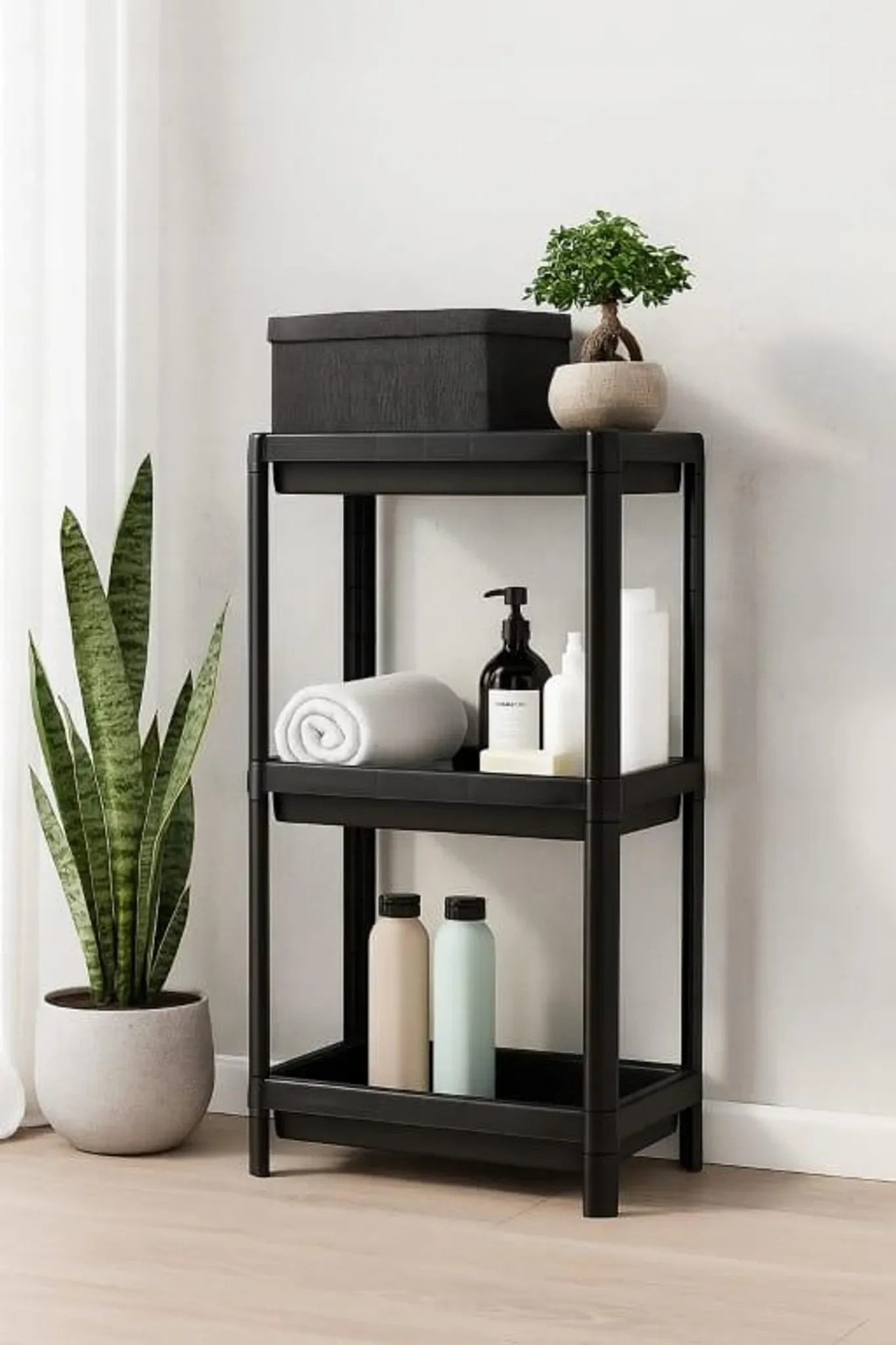 Das 3-stufige Kunststoff-Regal ist ein funktionelles und modernes Möbelstück, das sowohl im Badezimmer als auch in der Küche, im Büro oder Kinderzimmer eingesetzt werden kann. Das rechteckige Design in schwarzer Farbe wirkt elegant und passt sich nahtlos jedem Einrichtungsstil an.
