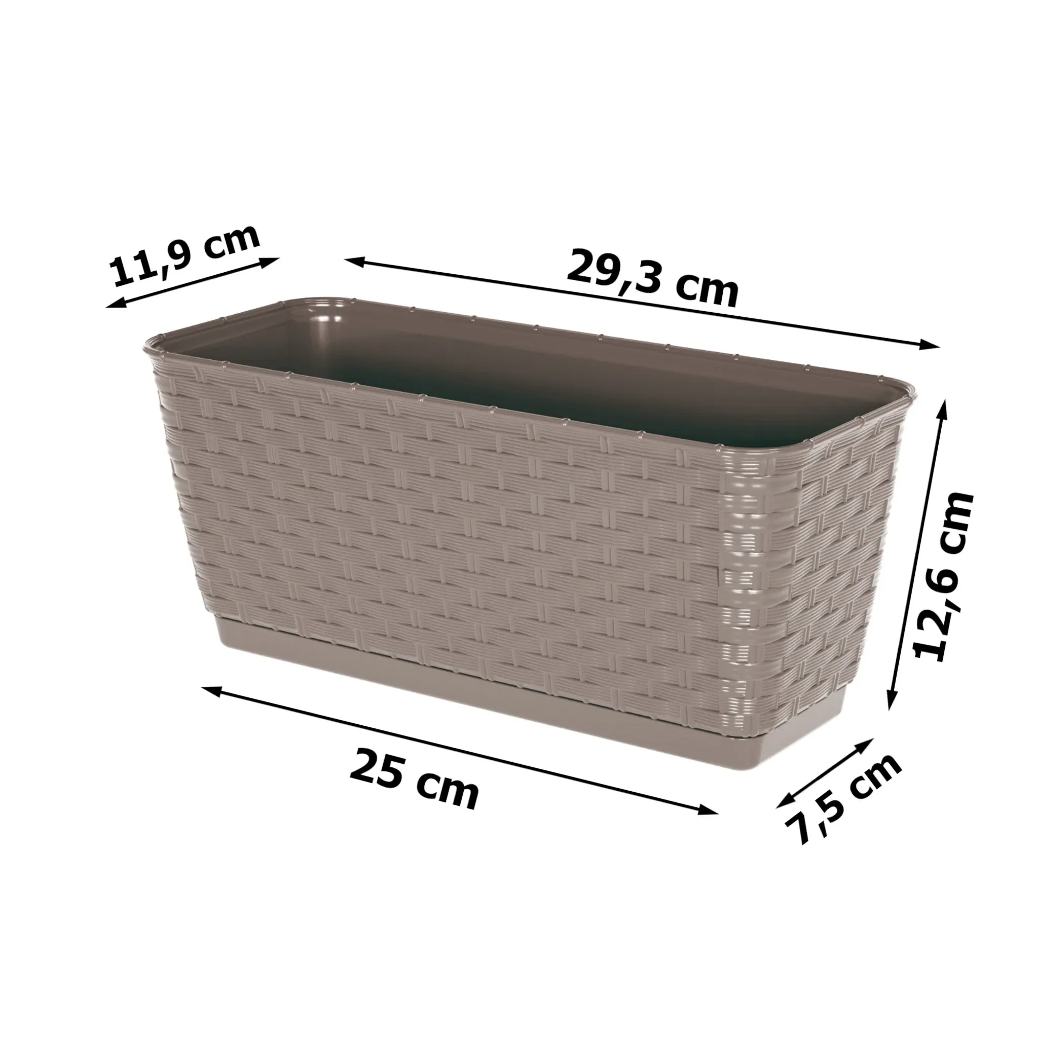 | Im Paket | 1 × Blumenkasten 29,3 cm in Mokka mit Bewässerungssystem (Rattan-Imitat) |