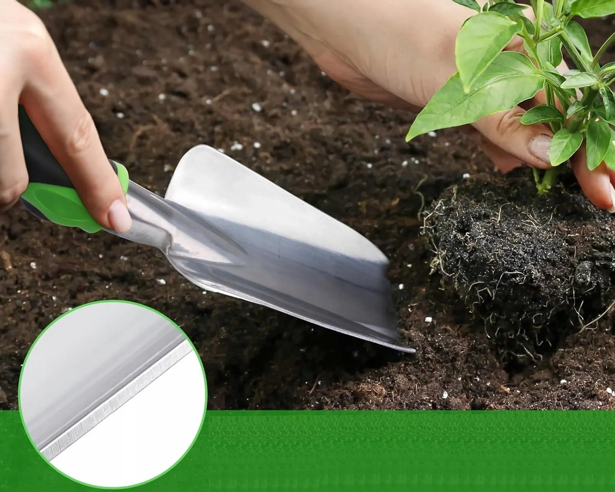 Das Gartengeräte-Set von Trade Safe ist die perfekte Grundausstattung für Hobby- und Profigärtner. Das Set besteht aus drei wichtigen Handwerkzeugen: einer Pflanzschaufel, einem Pflanztopf mit integrierter Messskala und einem dreizinkigen Krallenrechen. Alle Werkzeuge sind aus einer dicken, rostbeständigen Aluminiumlegierung gefertigt, die eine lange Lebensdauer garantiert – ideal zum Graben, Umpflanzen und Lockern von Erde.