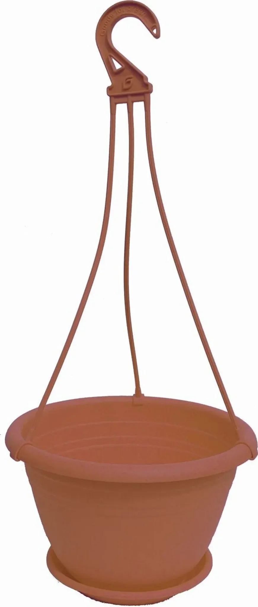 Highlights: Klassisch-runde Hängeampel in Terracotta, aus robustem Kunststoff, mit Untersetzer und Aufhänger, UV- und witterungsbeständig, ideal für Balkon und Garten.