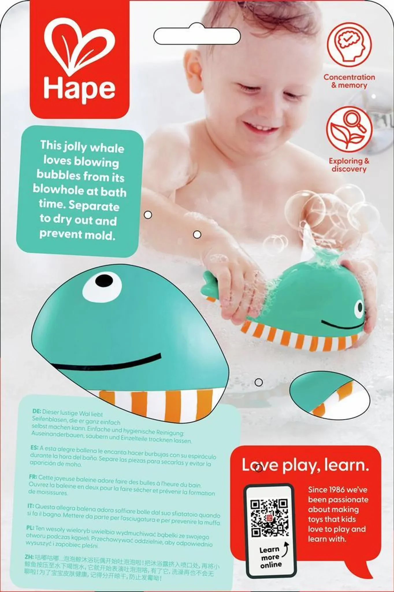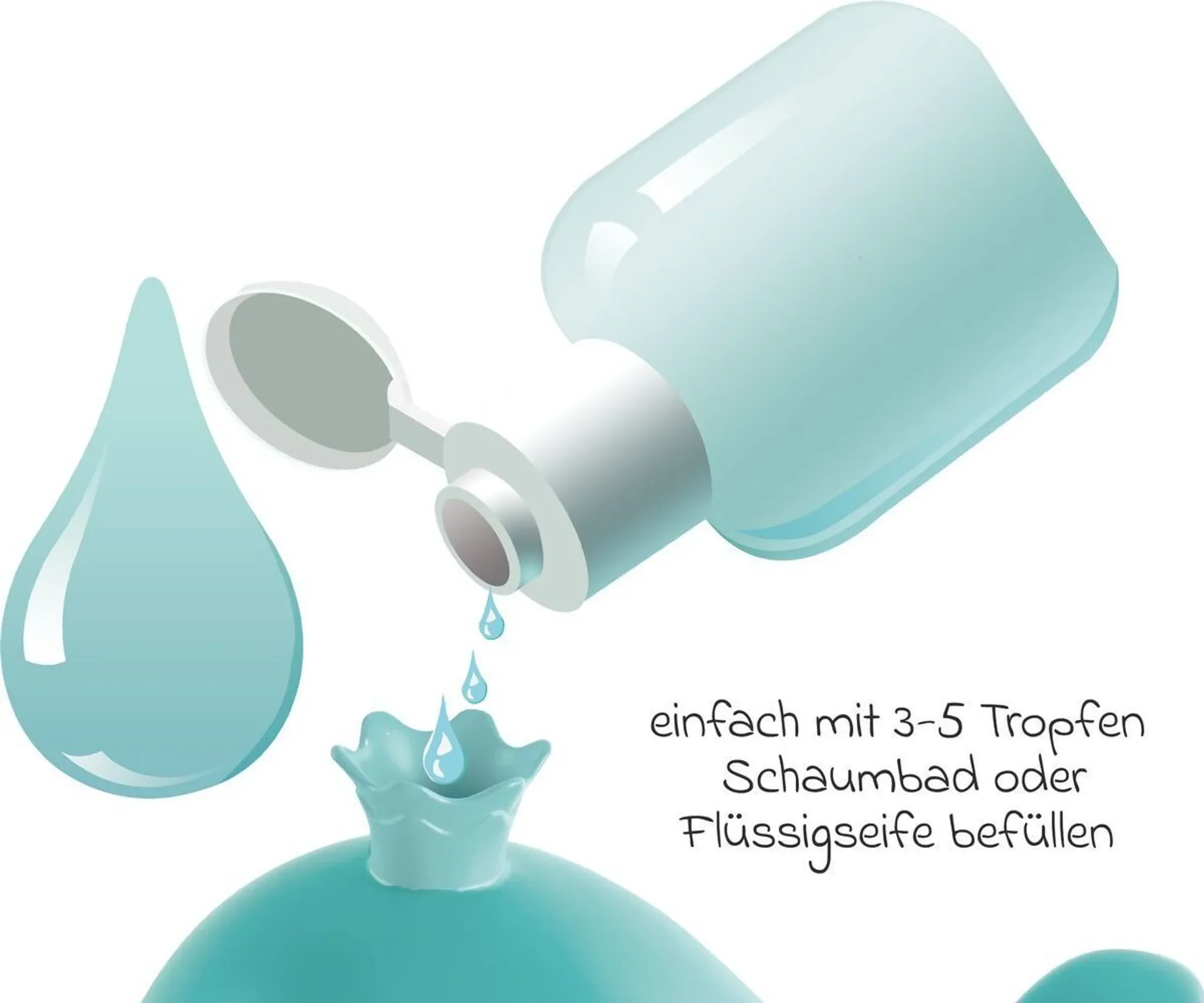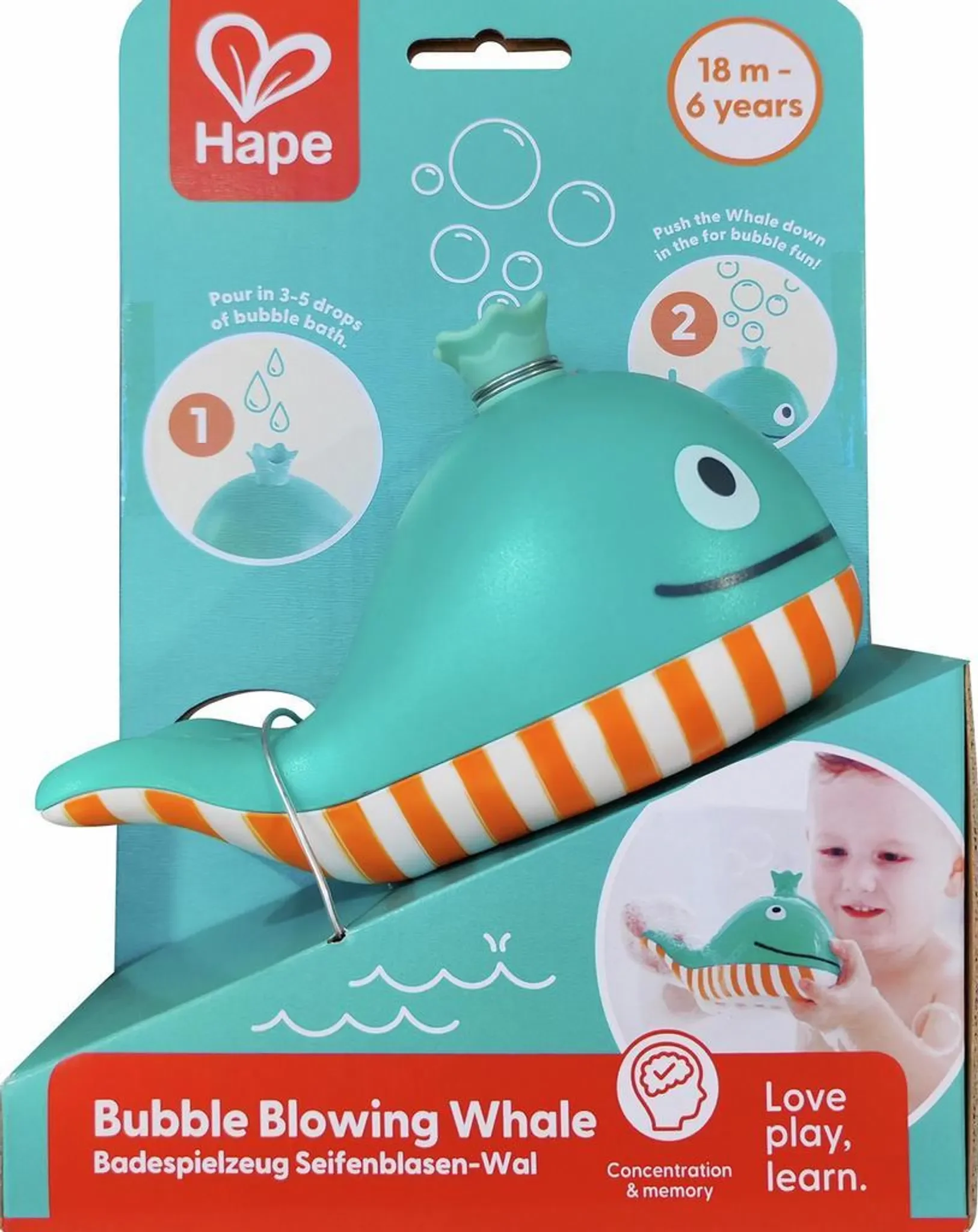 Mit dem Hape Seifenblasen-Wal wird das Baden zu einem sprudelnden Abenteuer! Dieser farbenfrohe Wal liebt es, Seifenblasen zu machen – einfach etwas Schaumbad oder Flüssigseife in seine Öffnung geben, kurz untertauchen und schon steigen kleine Blasen aus seinem Blasloch auf. So wird jedes Bad zum fröhlichen Erlebnis voller Lachen, Schaum und Fantasie.