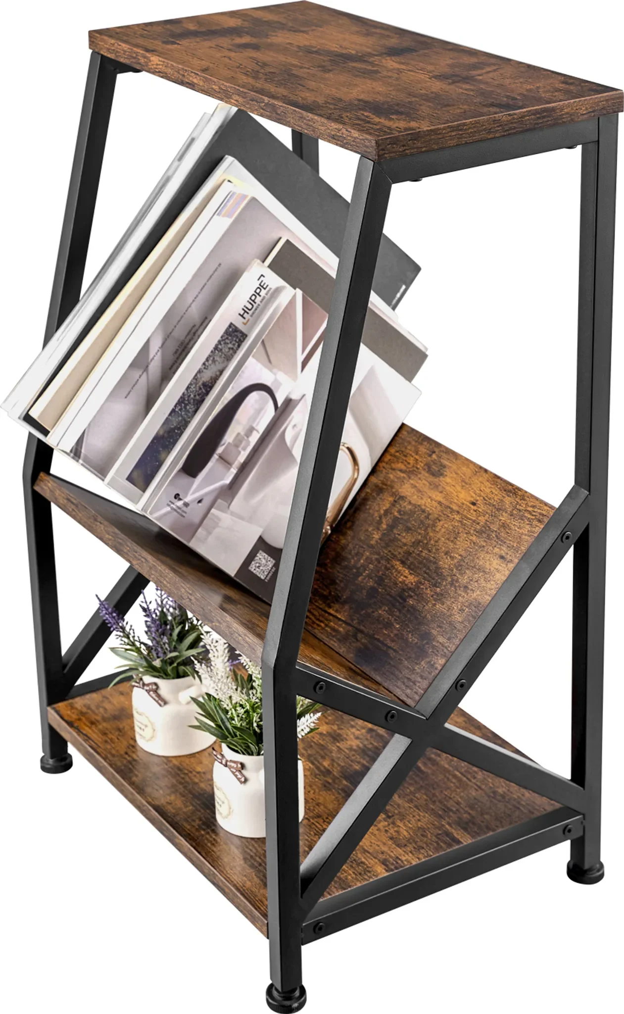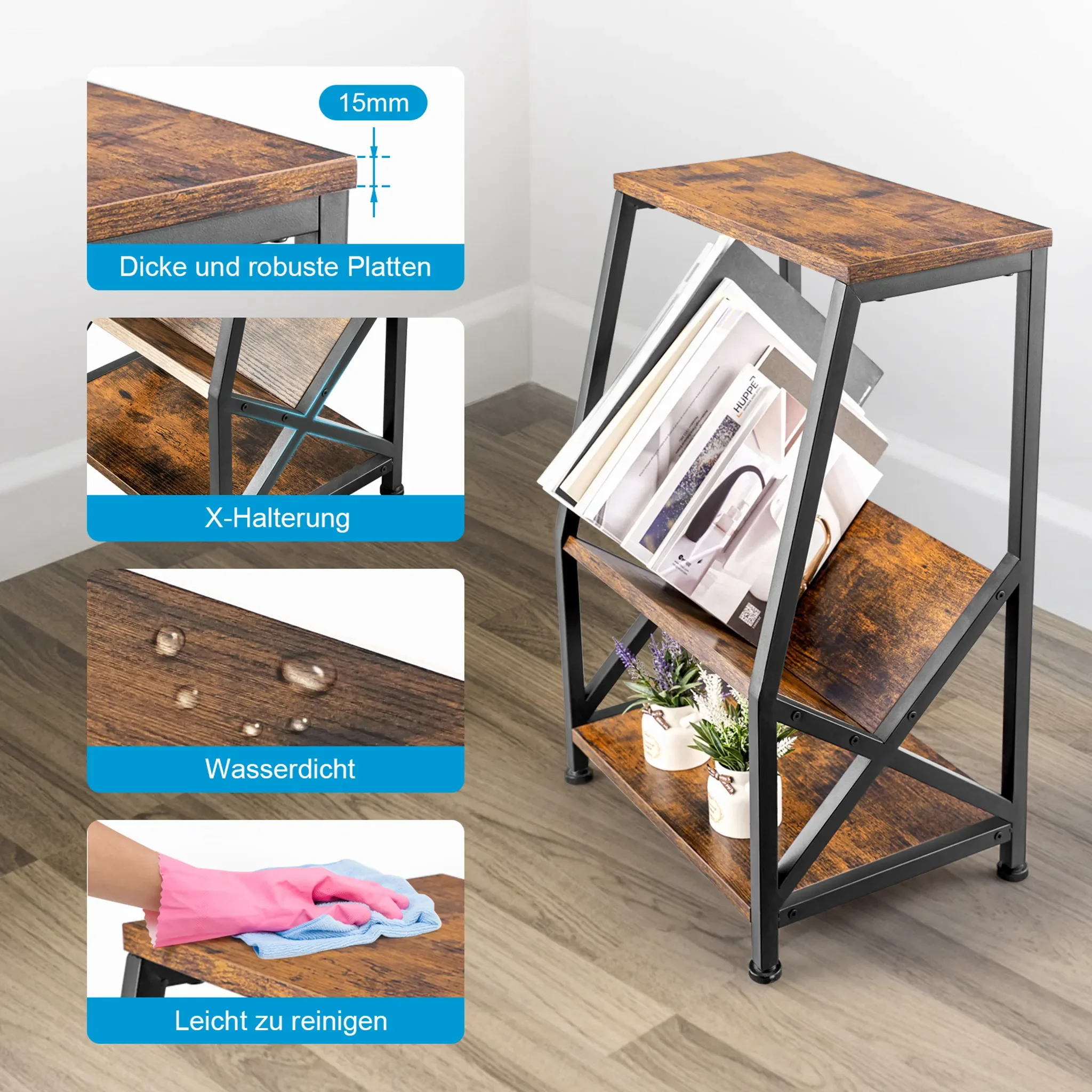 Mit drei Ablageebenen bietet der Tisch vielseitigen Stauraum: die obere Fläche für Getränke oder Dekoration, das mittlere 90°-Regal für Bücher und Magazine, und die untere Ebene für Pflanzen oder Aufbewahrungsboxen. Die stabile X-förmige Metallstruktur sorgt für hohe Stabilität, während die 15 mm starke Holzplatte langlebig und pflegeleicht ist.