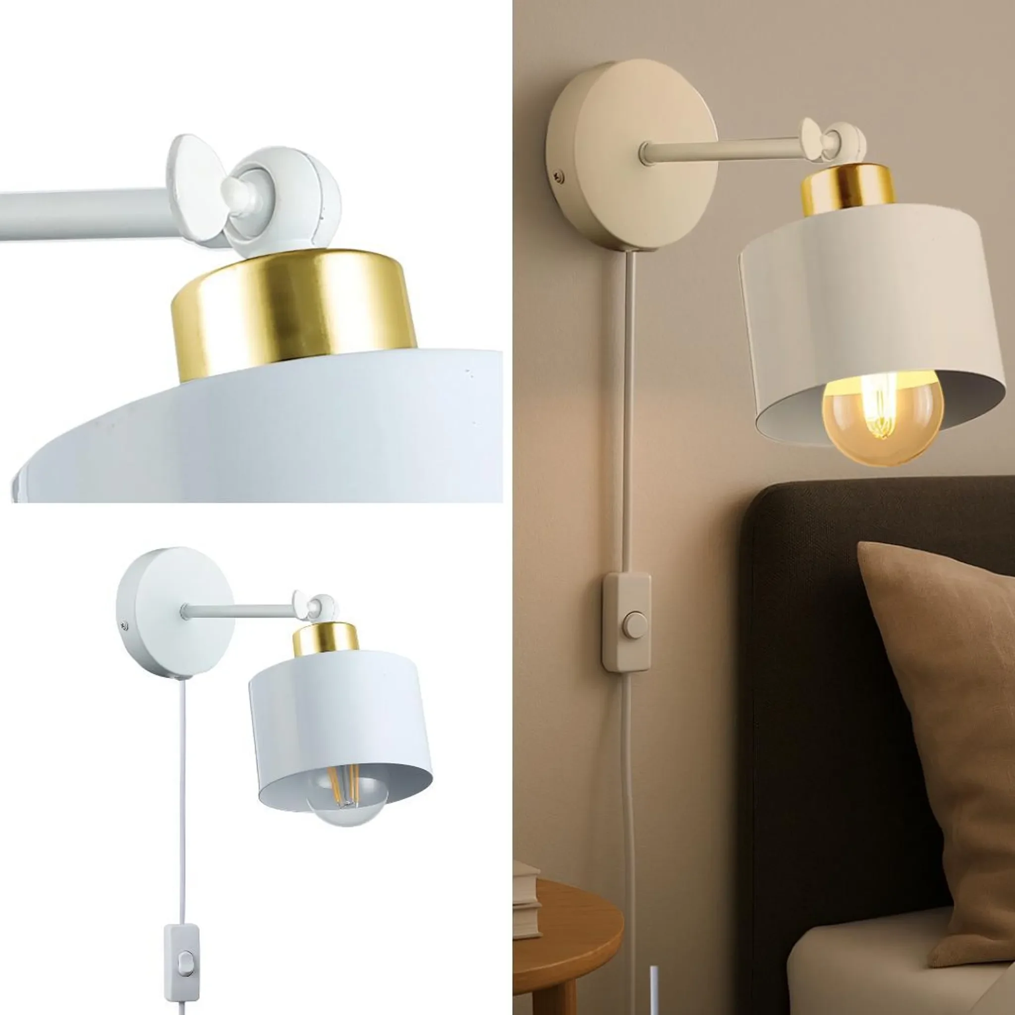 Highlights: Stilvolle Weiß-Gold-Kombination, 350° drehbar & 180° neigbar, kein Bohren dank Kabel mit Stecker, ideal als Lese- oder Akzentleuchte, kompatibel mit allen E27 LED-Leuchtmitteln.