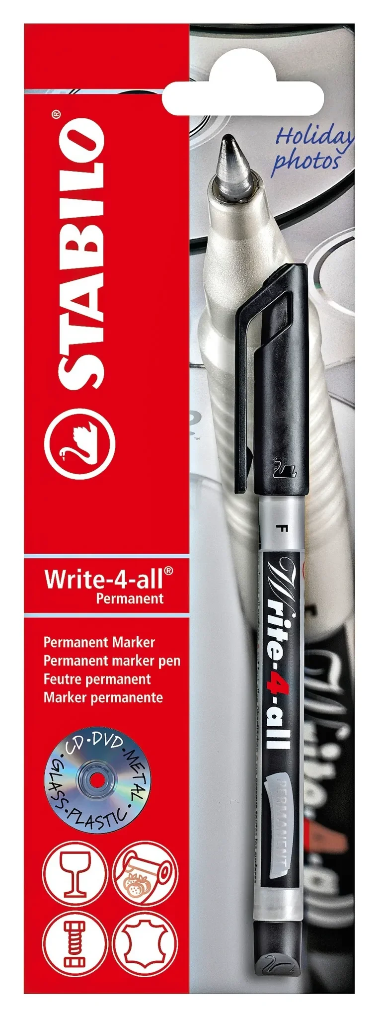 Der STABILO Write-4-all Permanent-Marker ist der robuste Allround-Schreiber für Büro, Handwerk und Haushalt. Seine feine 0,7 mm Kunststoff-Rundspitze schreibt präzise, klar und wischfest auf über 1.000 Oberflächen – darunter Glas, Kunststoff, Metall, Keramik, CDs und DVDs.