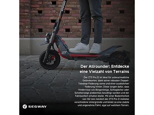 Der SEGWAY ZT3 Pro D ist für Nutzer geeignet, die eine große Reichweite, klare Displayinformationen und zuverlässige Bremsen wünschen. Mit 11-Zoll-Geländereifen, bis zu 70 km Reichweite und vernetzter Bedienung deckt er tägliche Wege wie auch längere Touren ab und passt damit zu vielseitiger Mobilität im urbanen Umfeld.
