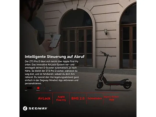 Der SEGWAY ZT3 Pro D E-Scooter kombiniert alltagstaugliche Reichweite mit stabiler Fahrdynamik. Mit bis zu 70 km pro Ladung eignet er sich für den täglichen Weg zur Arbeit, Erledigungen in der Stadt oder längere Ausfahrten am Wochenende. Die robuste Bauweise und die durchdachten Funktionen unterstützen eine souveräne Mobilität im urbanen Umfeld und darüber hinaus.