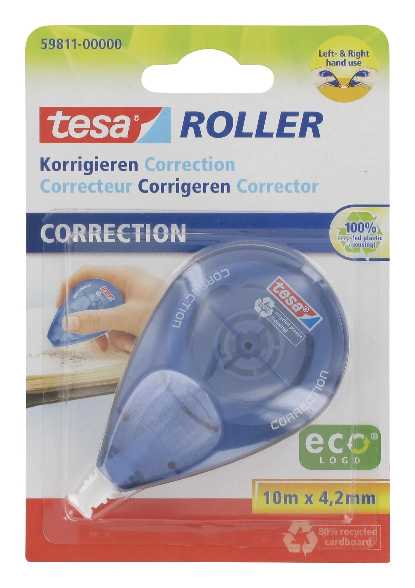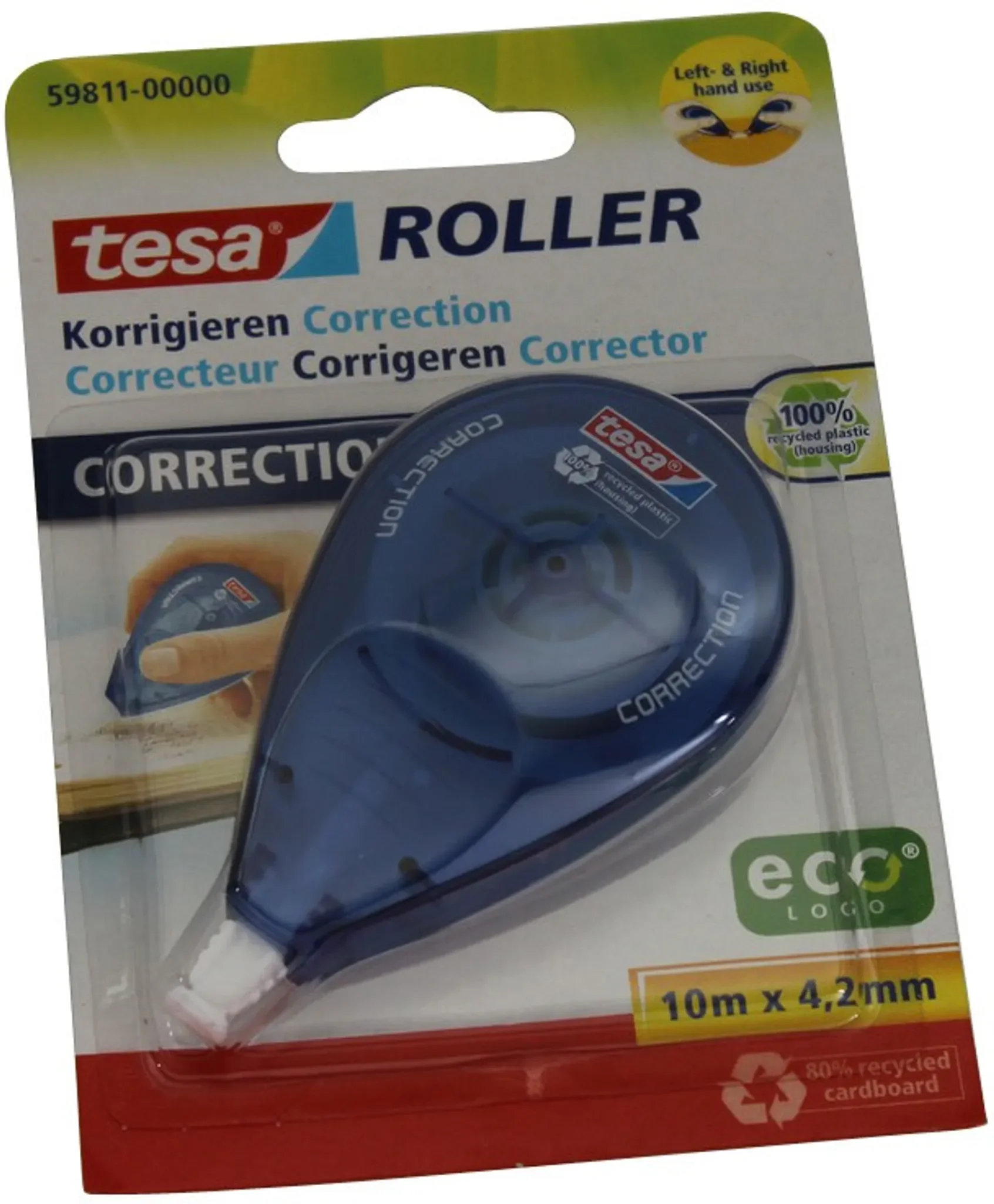 | Im Paket | 1 × Tesa Korrekturroller Seitwärtsroller ecoLogo (10 m × 4,2 mm), Blisterverpackung |