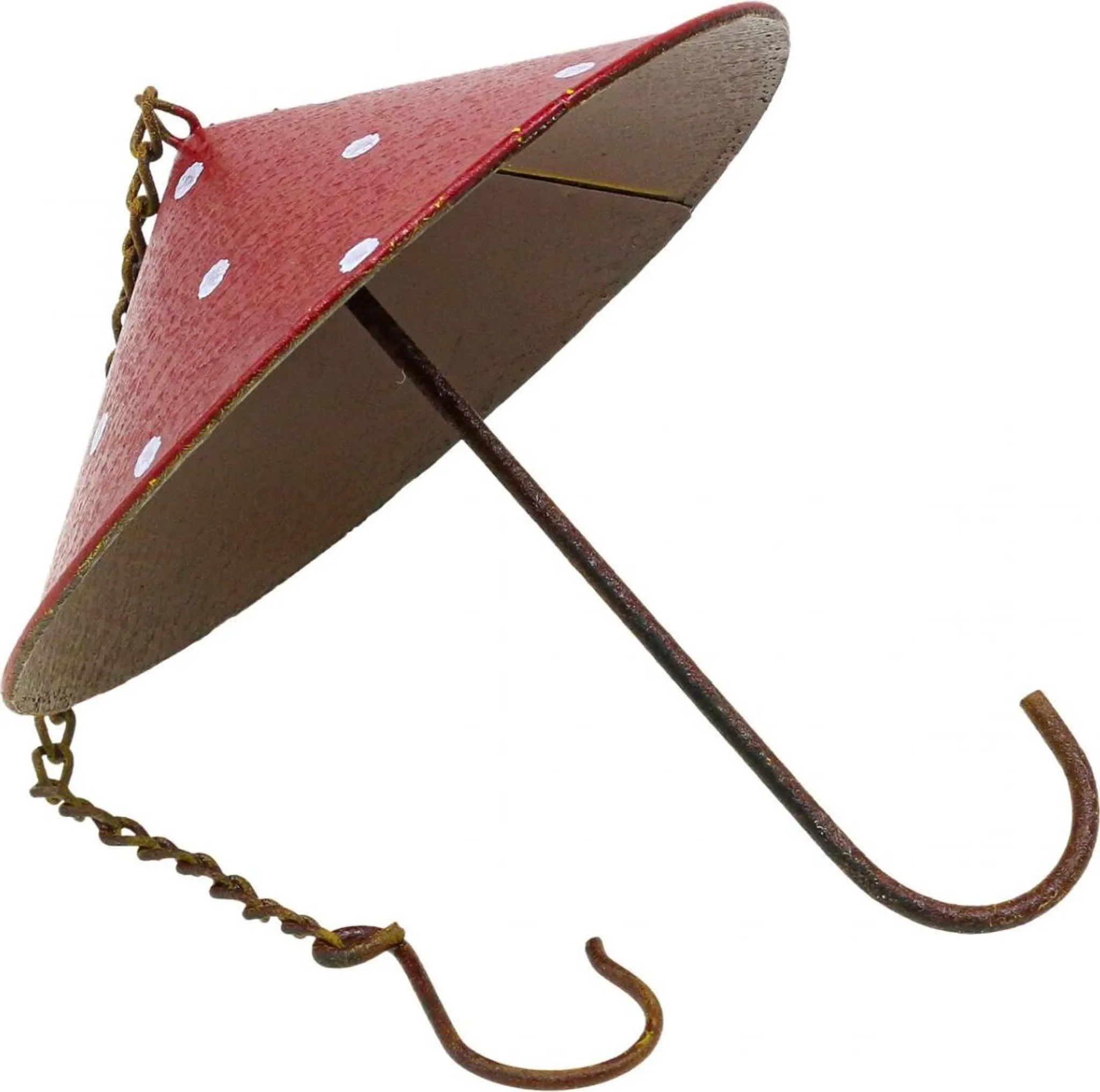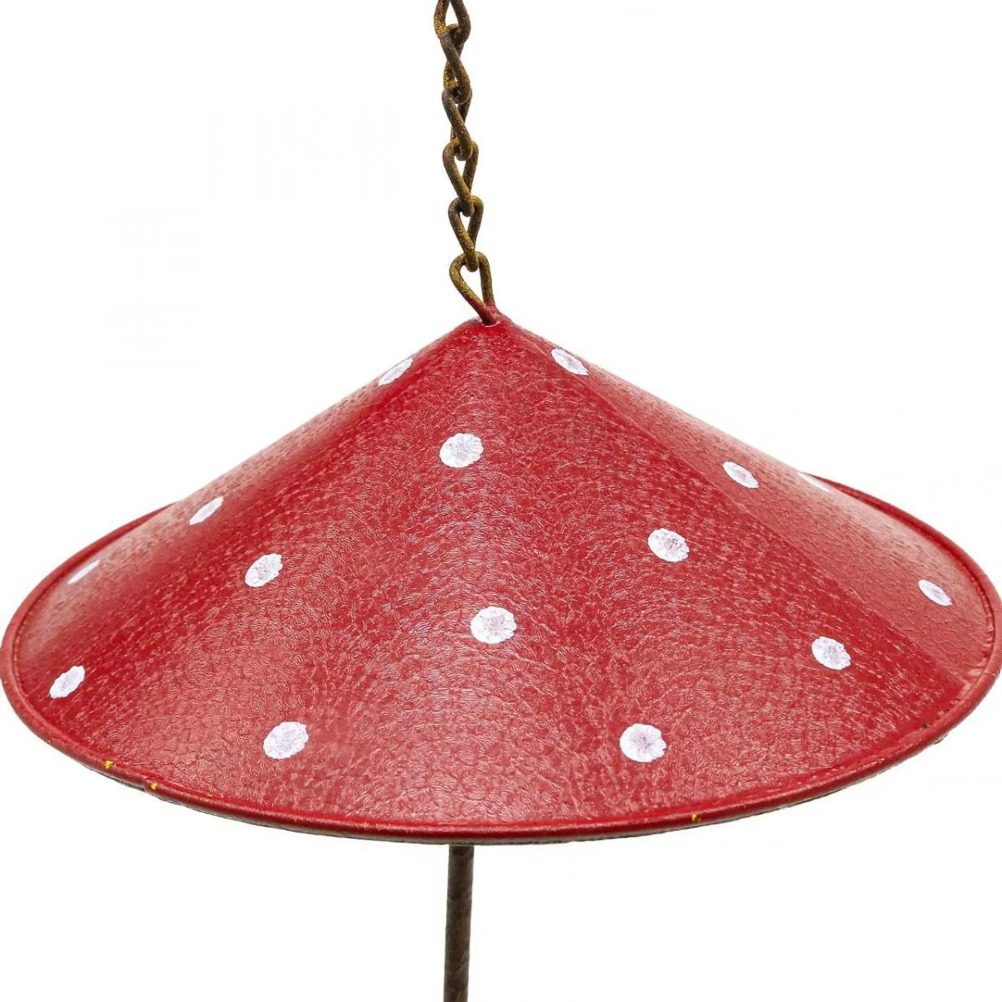 Highlights: Dekorative Vogelfutterstelle im Fliegenpilz-Look, robustes Metall, wetterfest, leicht aufzuhängen, ideal für Garten und Balkon.